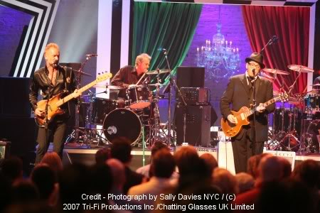 It opened with Costello singing, and beautifully, 'Every Breath You Take', a Police number, of course. Then the Policemen came on one by one, each representing a facet of the band's warring personality. Andy Summers was quiet and learned, no trouble at all. Stewart Copeland, the barmy American drummer, loudly claimed the band for himself. But the ownership dispute was quelled by the arrival of Sting, exuding authority, charisma and, less expectedly, humour.