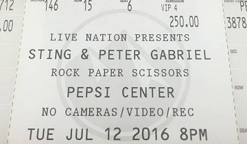 Early in Sting and Peter Gabriel’s Pepsi Center show, which was part of their Rock Paper Scissors tour, Gabriel told the audience that the set would be “a little like karaoke night in Denver.” Gabriel’s band, dressed in black with red stripes on parts of their clothing, was the red team while Sting’s band was the blue team. “You can hold out your scores, but we’re going to ignore them, because we’re going to carry on anyway,” Gabriel said...